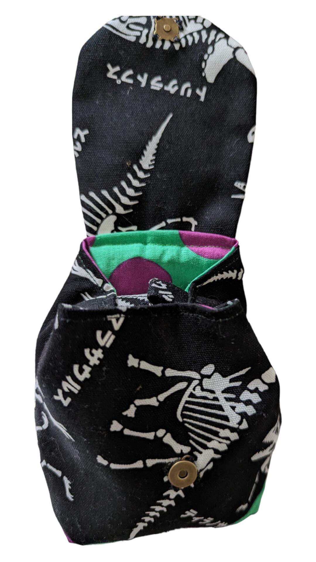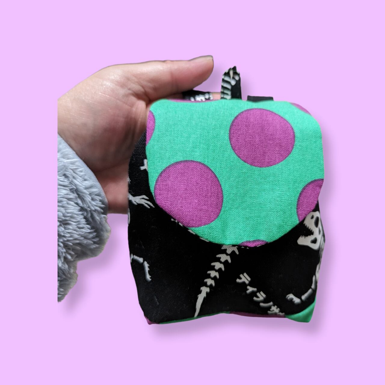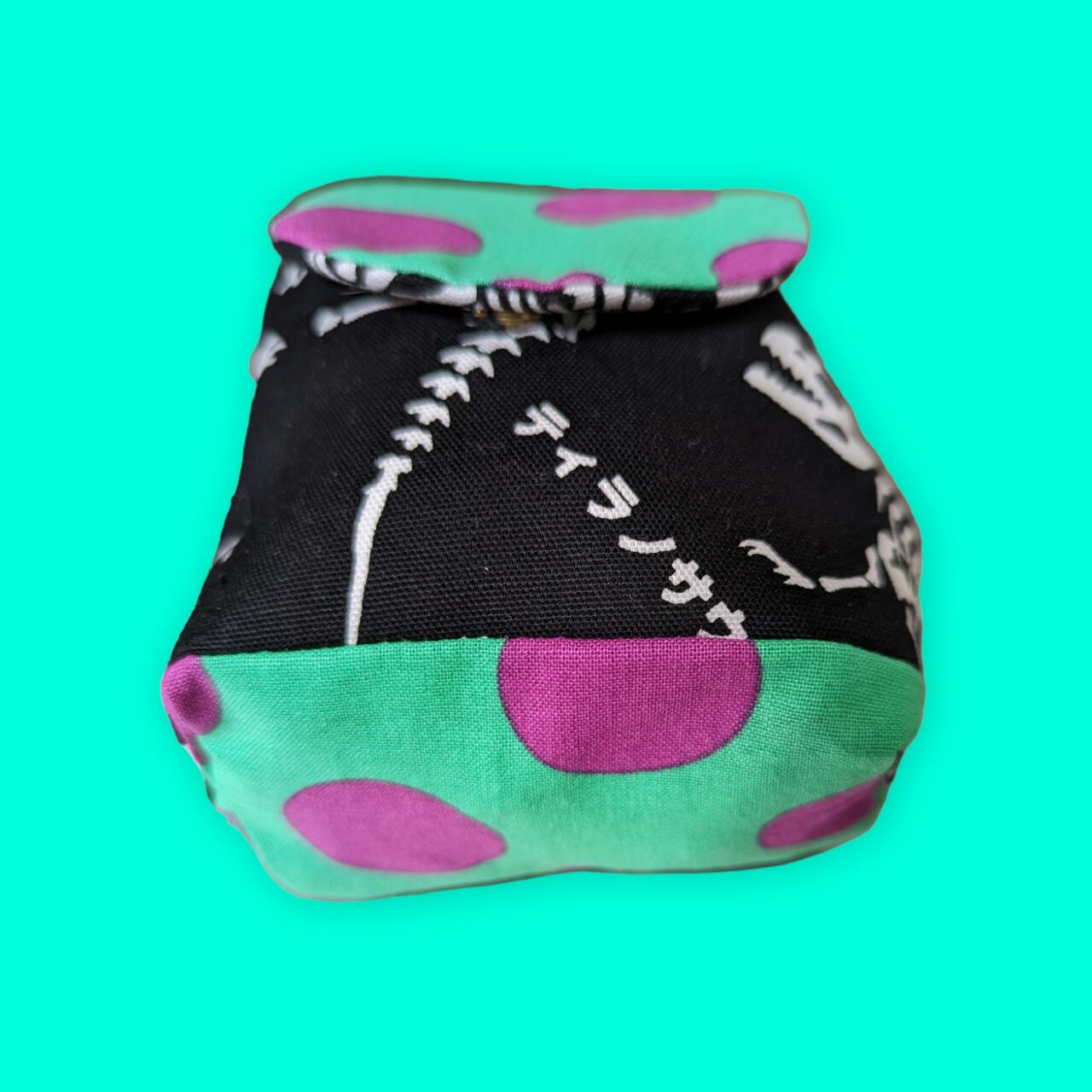 恐竜柄とドット柄の組み合わせのミニミニリュックサックになります。 肩紐調節可能となります。 縦 11cm 横 10cm マチ 6cm